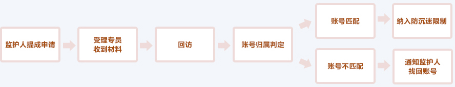 在监护人发现被监护人有沉溺厦门博大虎平台的情况下,监护人可向游家公司申请发起未成年人家长监护机制。 监护人需亲自通过邮寄方式 向我司提供有效材料,向游家公司提出未成年人账户监控的申请。在收到邮件后,我司即开始启动监护机制审核流程,首先进入疑似账号身份确认期。